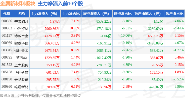 从资金流向上来看,当日金属新材料板块主力资金净流出6.51亿元,游资资金净流入6722.74万元,散户资金净流入5.84亿元。金属新材料板块个股资金流向见下表: