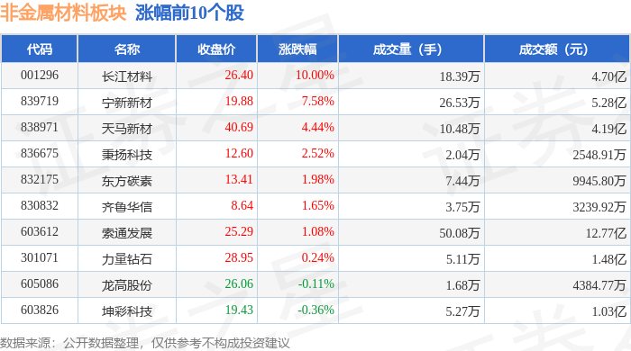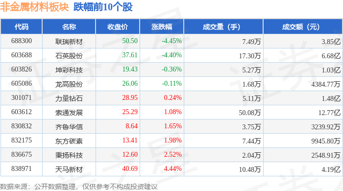 九游体育证券之星消息,9月4日非金属材料板块较上一交易日下跌1.71%,联瑞新材领跌。当日上证指数报收于3765.88,下跌1.25%。深证成指报收于12118.7,下跌2.83%。非金属材料板块个股涨跌见下表: